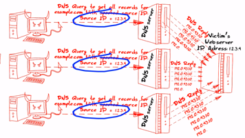 حمله DNS Amplification: در این نوع از حمله DDOS شخص مخرب ip خود را با ip سرور قربانی عوض میکند در نتیجه وقتی درخواست می فرستد تا dns server یک ip را ترجمه کند، پاسخ این درخواست به خود سرور هدف میرود. حالا این شخص مخرب این درخواست ها را از چندین سرور میفرستد به این صورت که معمولا برای افزایش بار بر روی سرور از DNS Server ها تمام ساب دامنه های سرور قربانی را هم درخواست میکند که به این صورت سرور قربانی زمان بیشتری برای پاسخگویی به درخواست ها لازم داشته باشد. درنتیجه تعداد زیادی پاسخ با حجم بالا به سمت سرور هدف فرستاده میشود و سرور قربانی هنگ میکند.